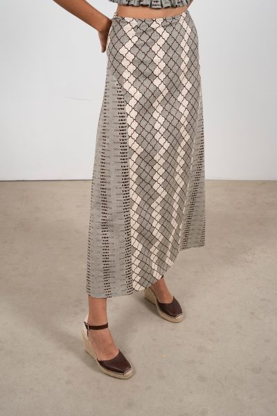 Falda estampada de corte sirena, sin cinturilla y con cremallera trasera. Silueta escultural para tu día a día; estampado protagonista, perfecto para looks veraniegos con sello chic.