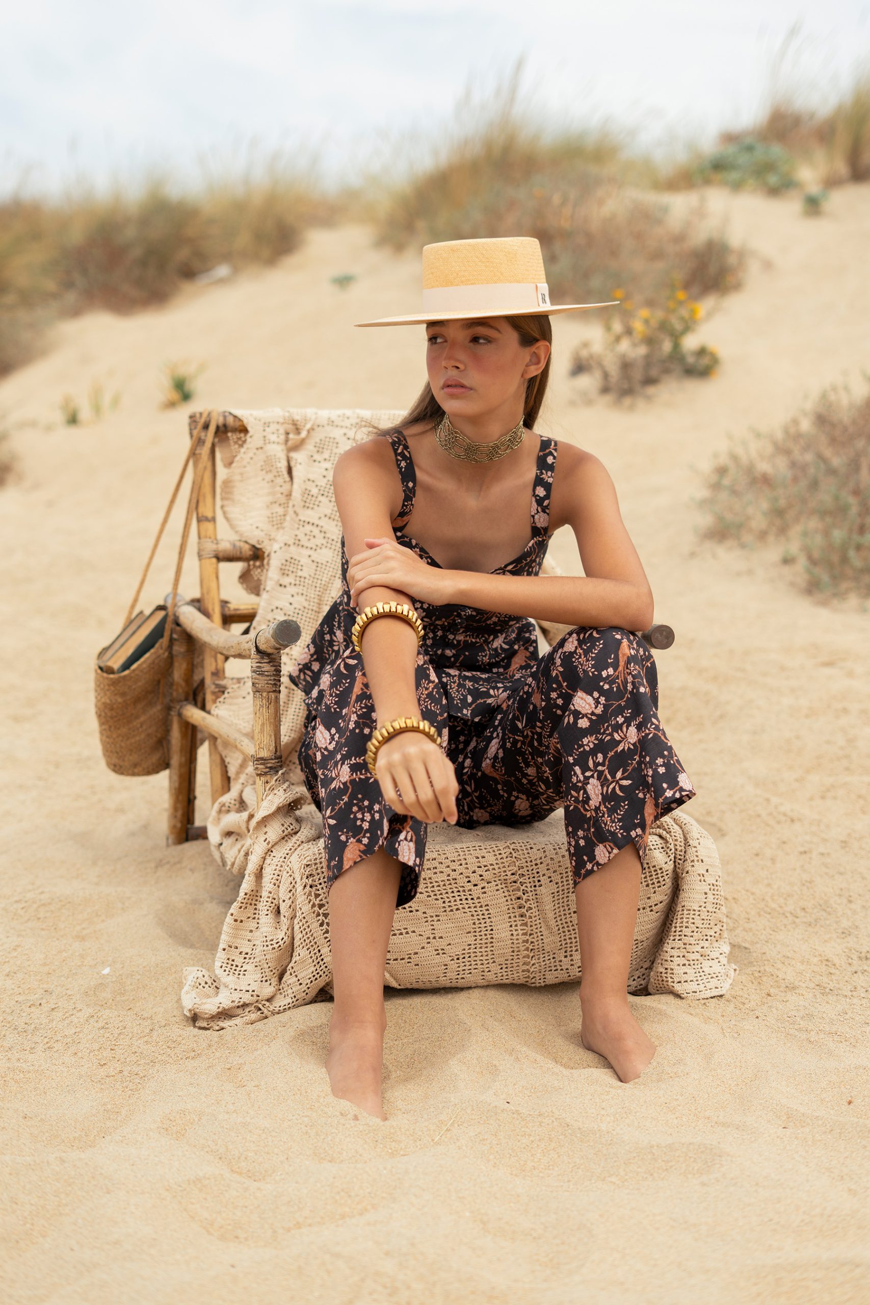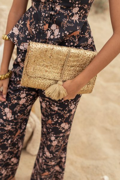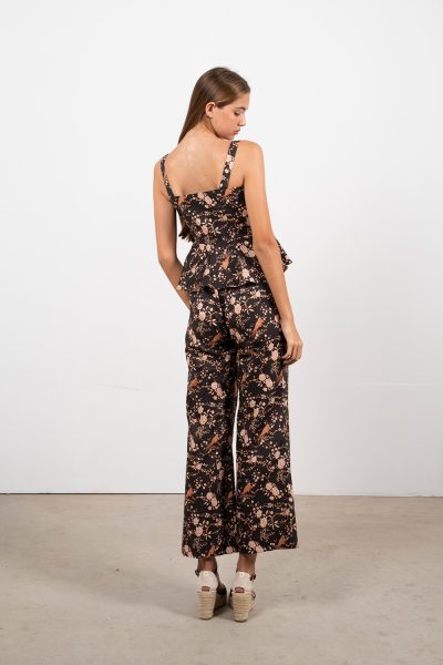 Top de tirantes en lino estampado con botonadura frontal y corte peplum, combinado con pantalón de pinzas de cintura alta, cierre delantero con botón y cremallera. Conjunto fresco y elegante que mezcla estructura y movimiento, perfecto para días soleados y cócteles informales con aire sofisticado.