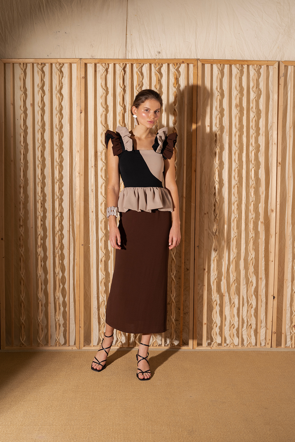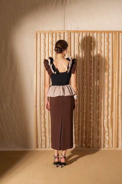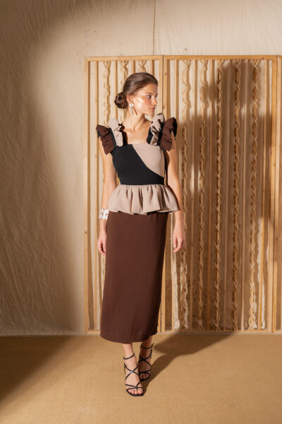 Vestido tricolor péplum con volantes: sofisticado y femenino, este vestido tricolor combina un corte péplum que define la cintura con mangas de tirantas y volantes rizados que aportan movimiento y encanto. La falda lápiz de largo midi estiliza la figura y añade un aire elegante y contemporáneo, perfecto para eventos y comidas especiales. Su juego de tonos crea contraste y presencia; llévalo con tacones y accesorios minimalistas para un look pulido e impactante.