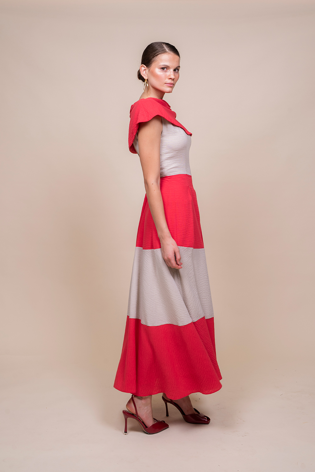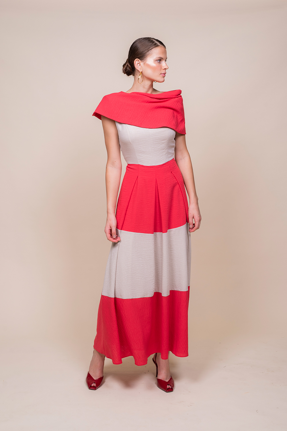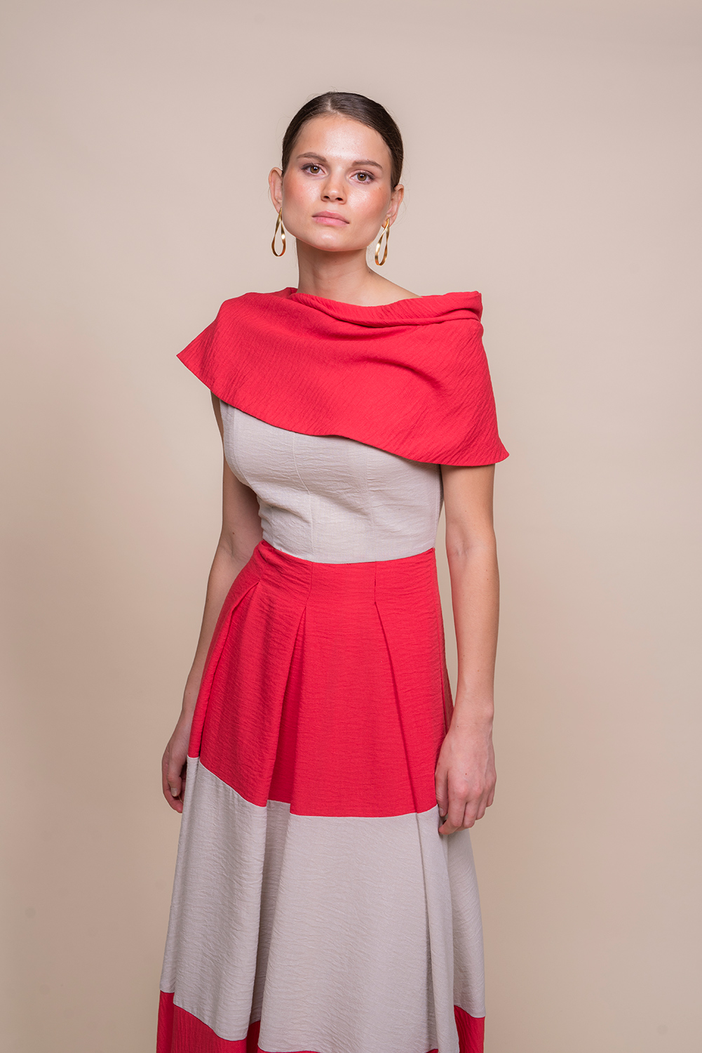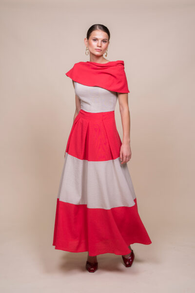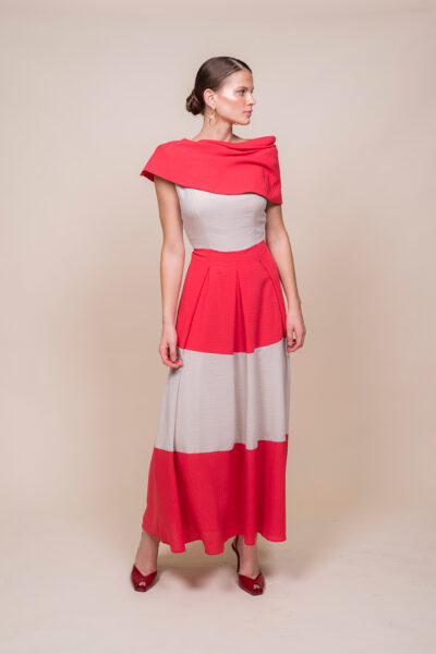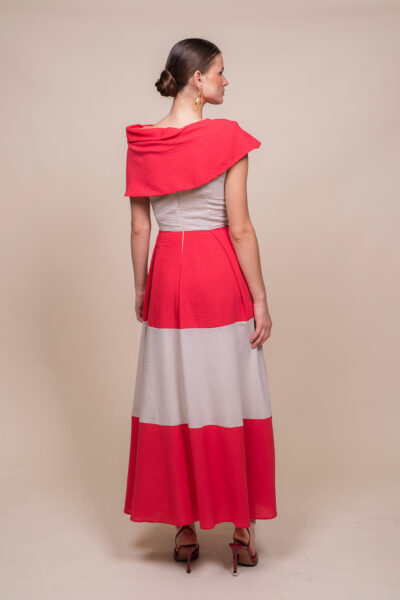 Vestido bicolor con escote barco vuelto: elegante y contemporáneo, este diseño combina dos tonos contrastados que realzan la silueta. Escote barco vuelto que aporta sofisticación; corte a la cintura que define la figura y falda midi plisada que añade movimiento y textura en cada paso. Perfecto para eventos y cocktails, se integra con tacones o bailarinas según la ocasión. Versátil, chic y con acabado impecable.