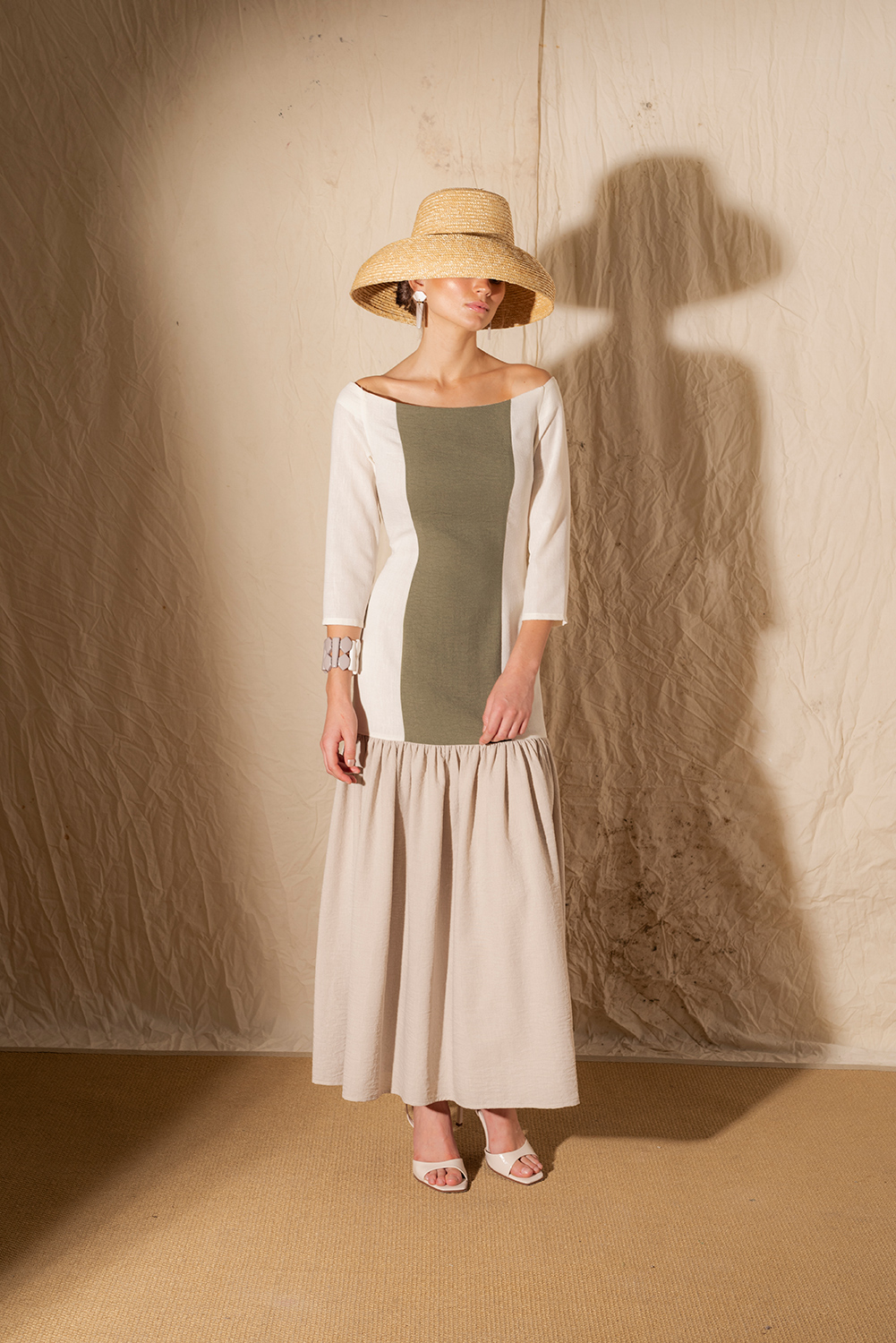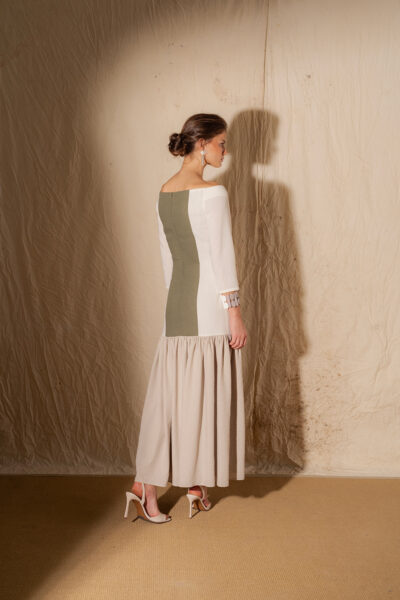 Vestido tricolor Bardot midi: elegante y contemporáneo, este vestido tricolor presenta un escote Bardot que realza hombros y cuello con un aire romántico. Con corte debajo de cadera y largo midi, estiliza la figura alargando la silueta, mientras la manga francesa aporta equilibrio y sofisticación. Perfecto para eventos y ocasiones especiales, su combinación de tonos crea un impacto visual refinado. Combínalo con tacones y clutch minimalista para un look impecable.