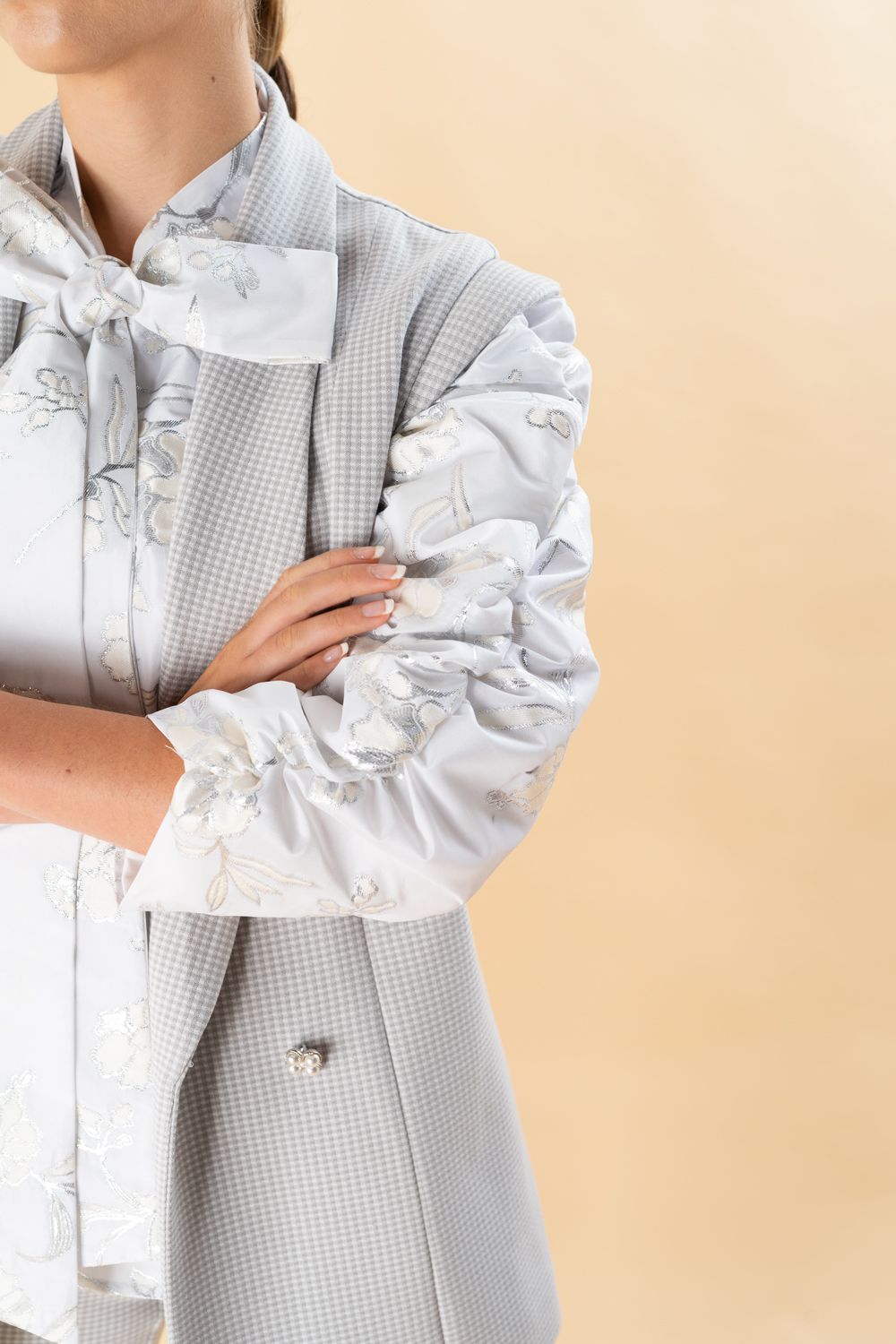 Blusa en jacquard con hilo de lúrex plata, maxi lazada y mangas tres cuartos drapeadas. La modelo mide 1,75 y talla S.