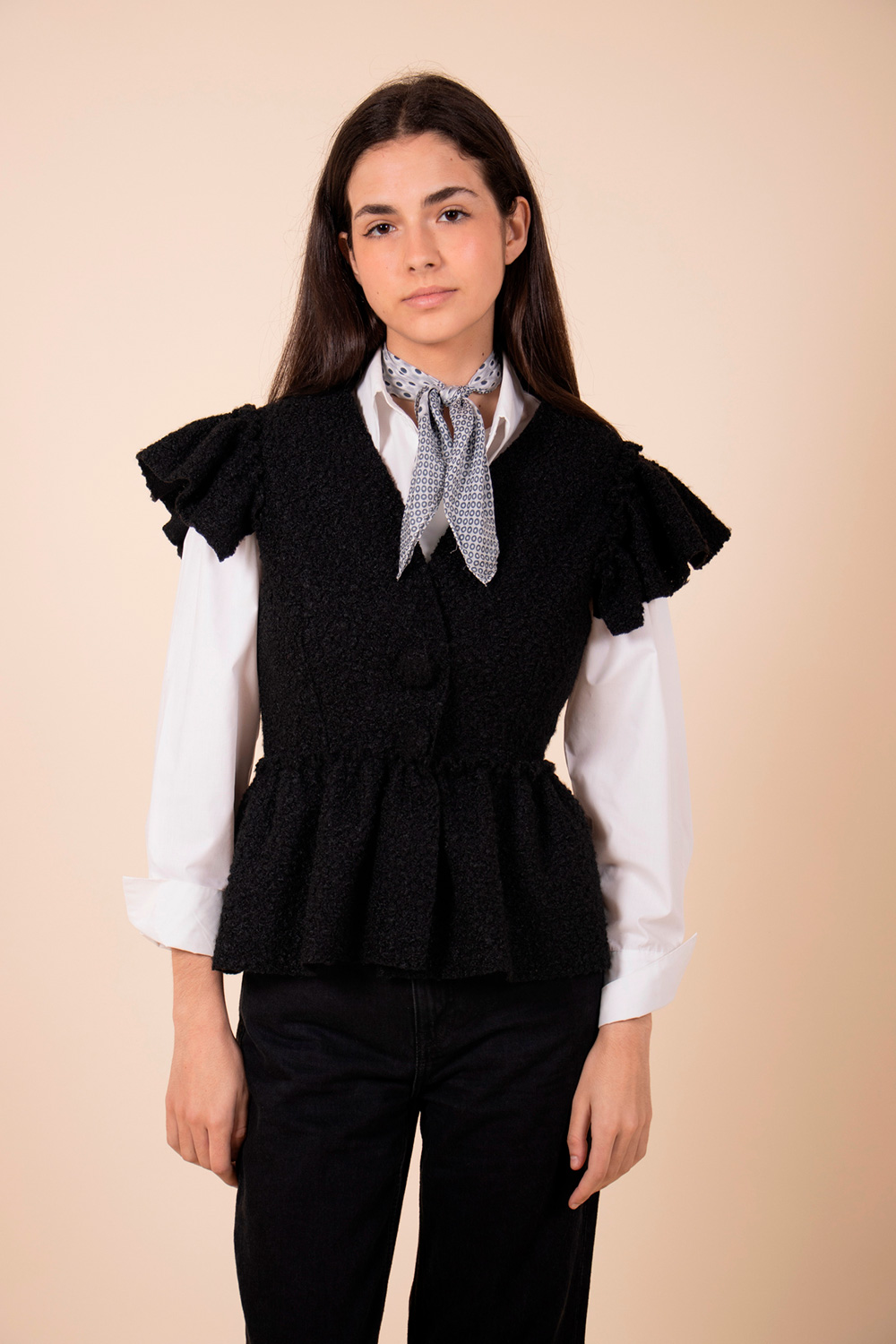 Nuestro chaleco de mujer Nova, es de corte peplum y mangas con volantes rizados, doble botonadura forrada en cintura. Ideal para combinar con vaqueros o con nuestro pantalón Opal y si quieres conseguir el look perfecto puedes llevar debajo nuestra blusa Estela.