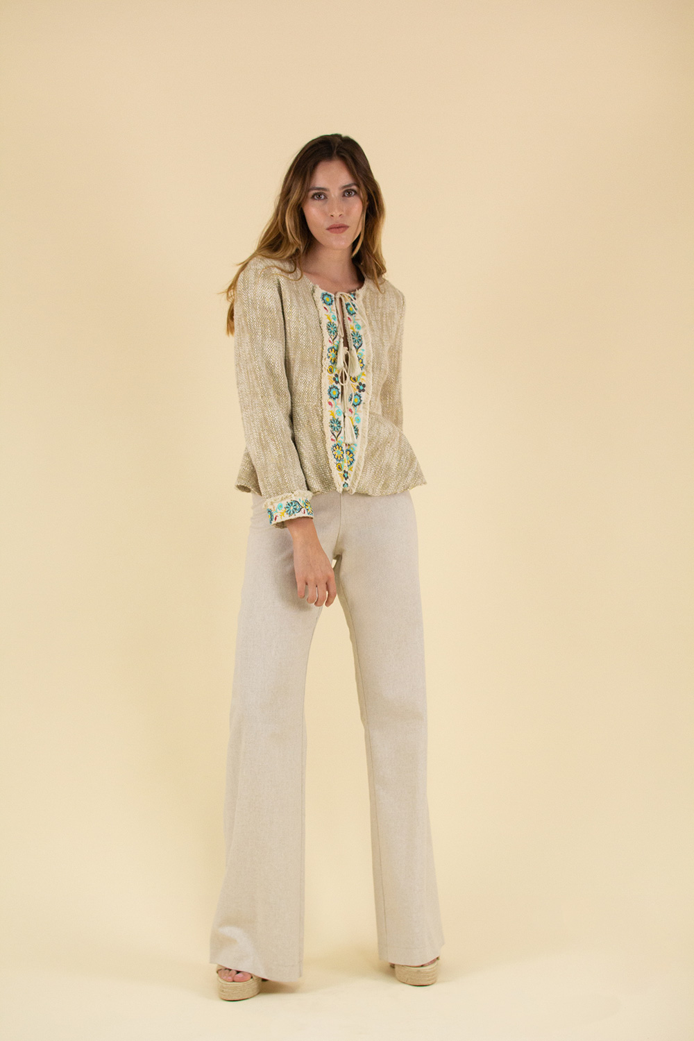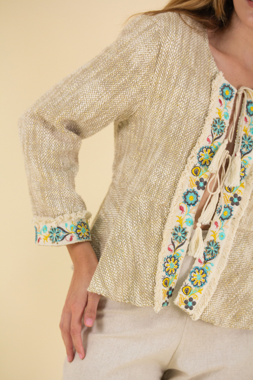 Descubre la elegancia de nuestra chaqueta peplum, donde el estilo se encuentra con la feminidad. Con un delicado bordado floral en el frente y los puños, esta pieza resalta tu figura y añade un toque de frescura a cualquier atuendo. Perfecta para ocasiones especiales o para un look diario con un giro chic. ¡Hazla tuya!