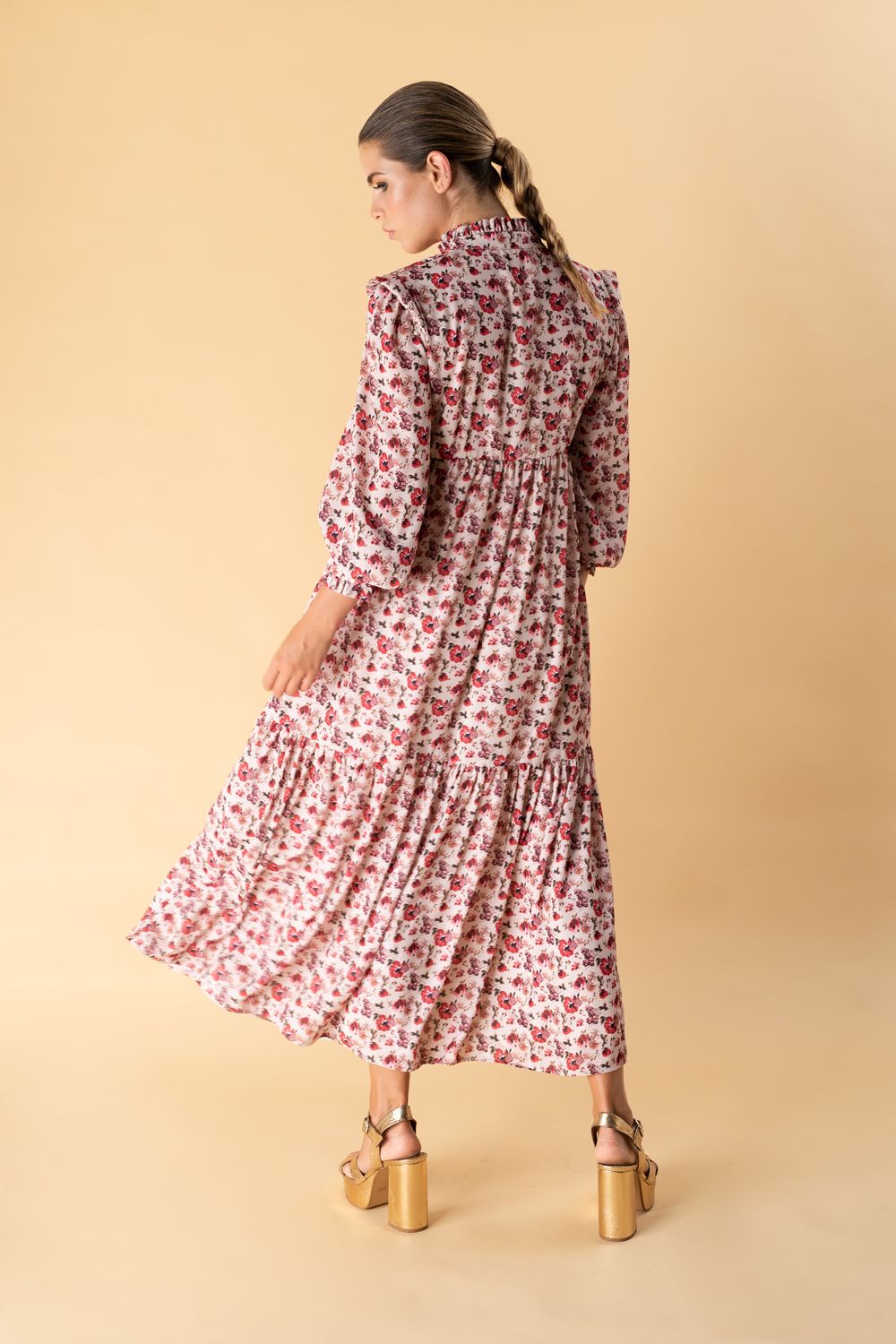 Vestido de largo midi con cuello maho, botonadura forrada y minihombrera, manga larga, puño y cuello adornado con minivolante plisado. La modelo mide 1,75 y talla S.