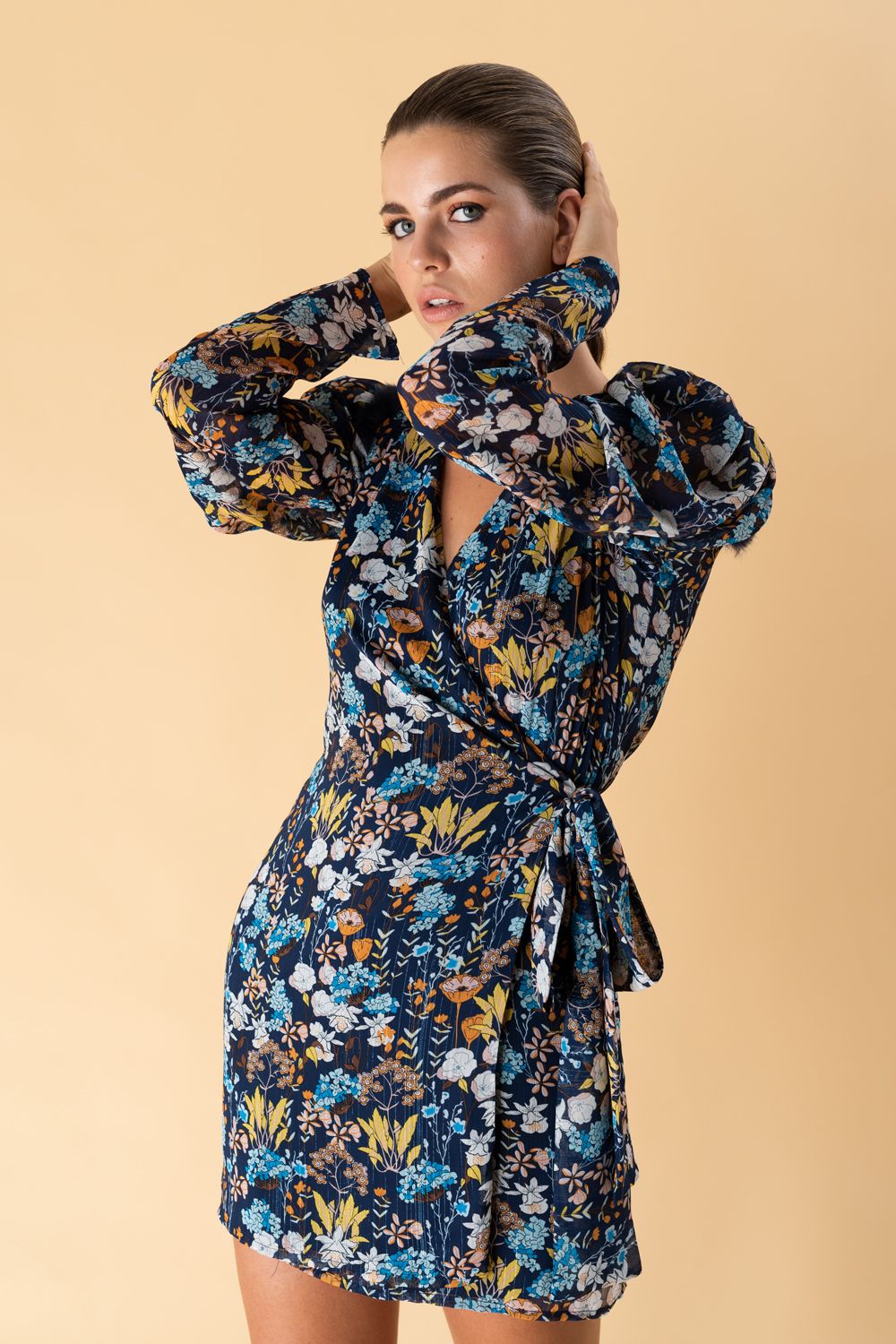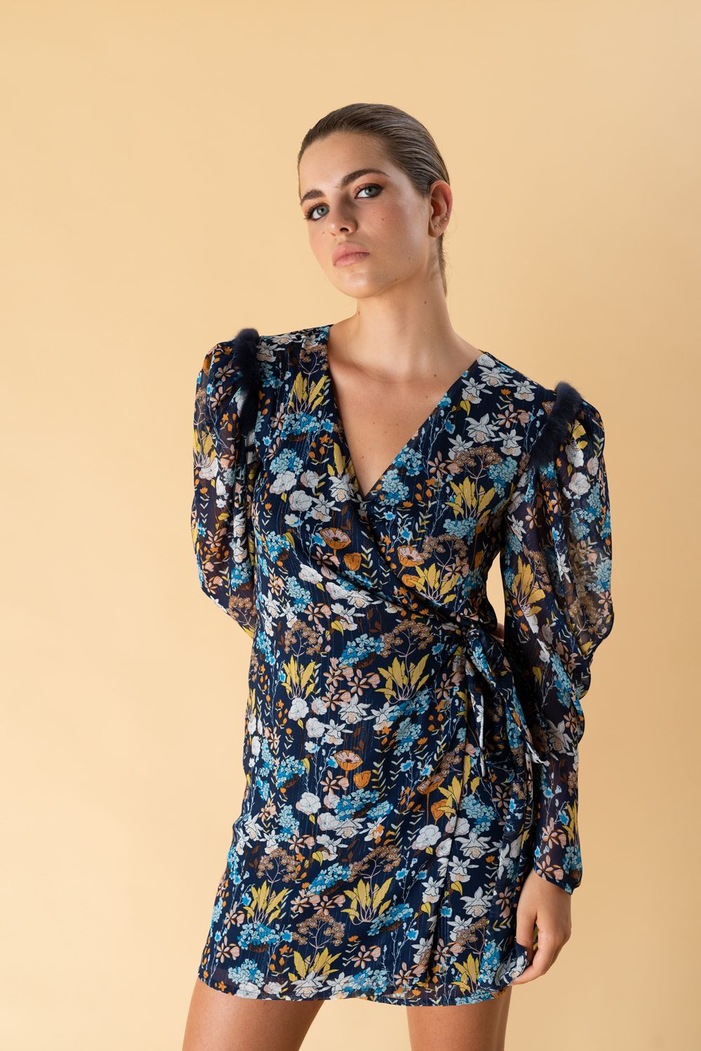 Vestido cruzado anudado en un lateral en gasa estampada con hilo de lúrex dorado. y detalle de pelo natural en hombros. La modelo mide 1,75 y talla S.