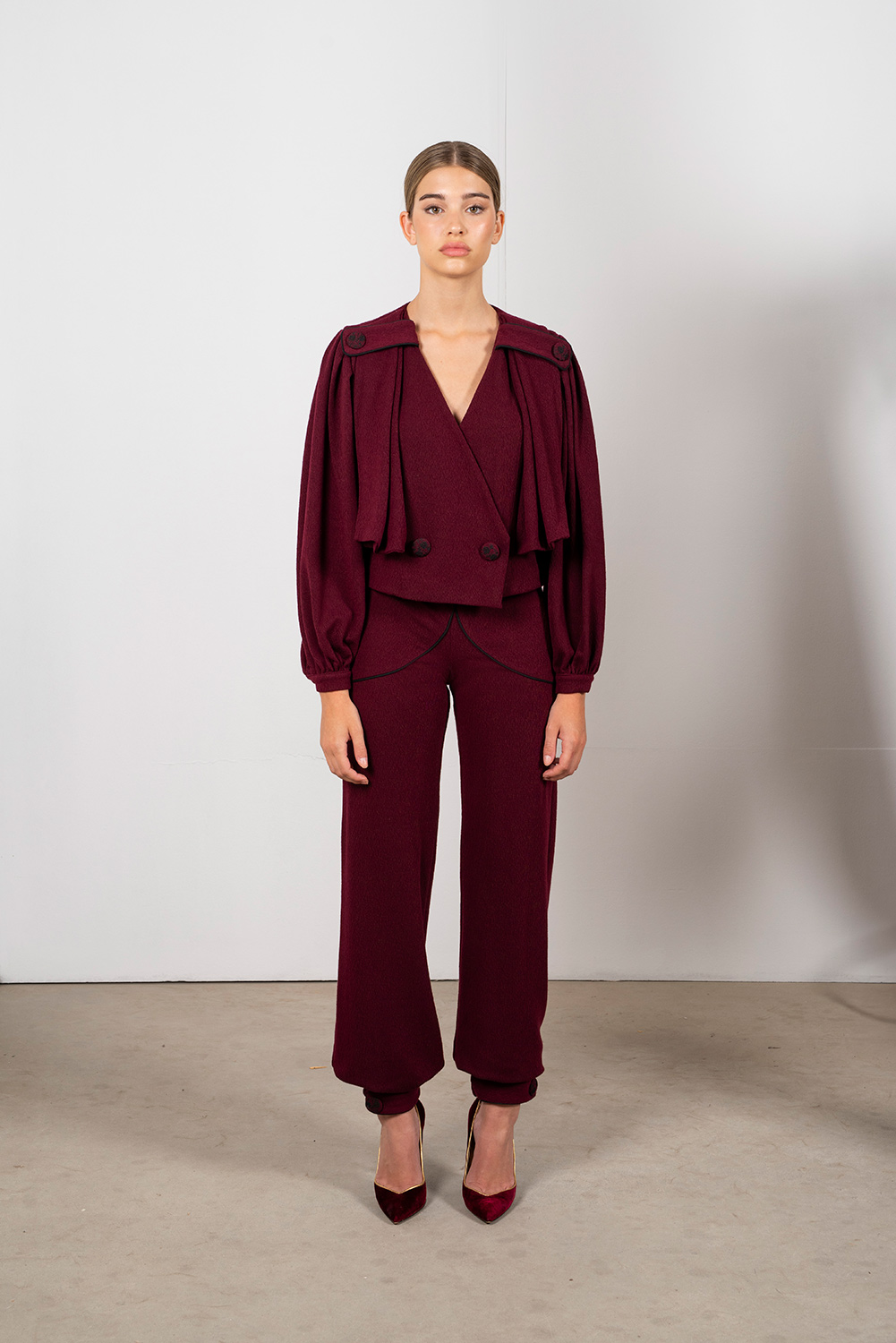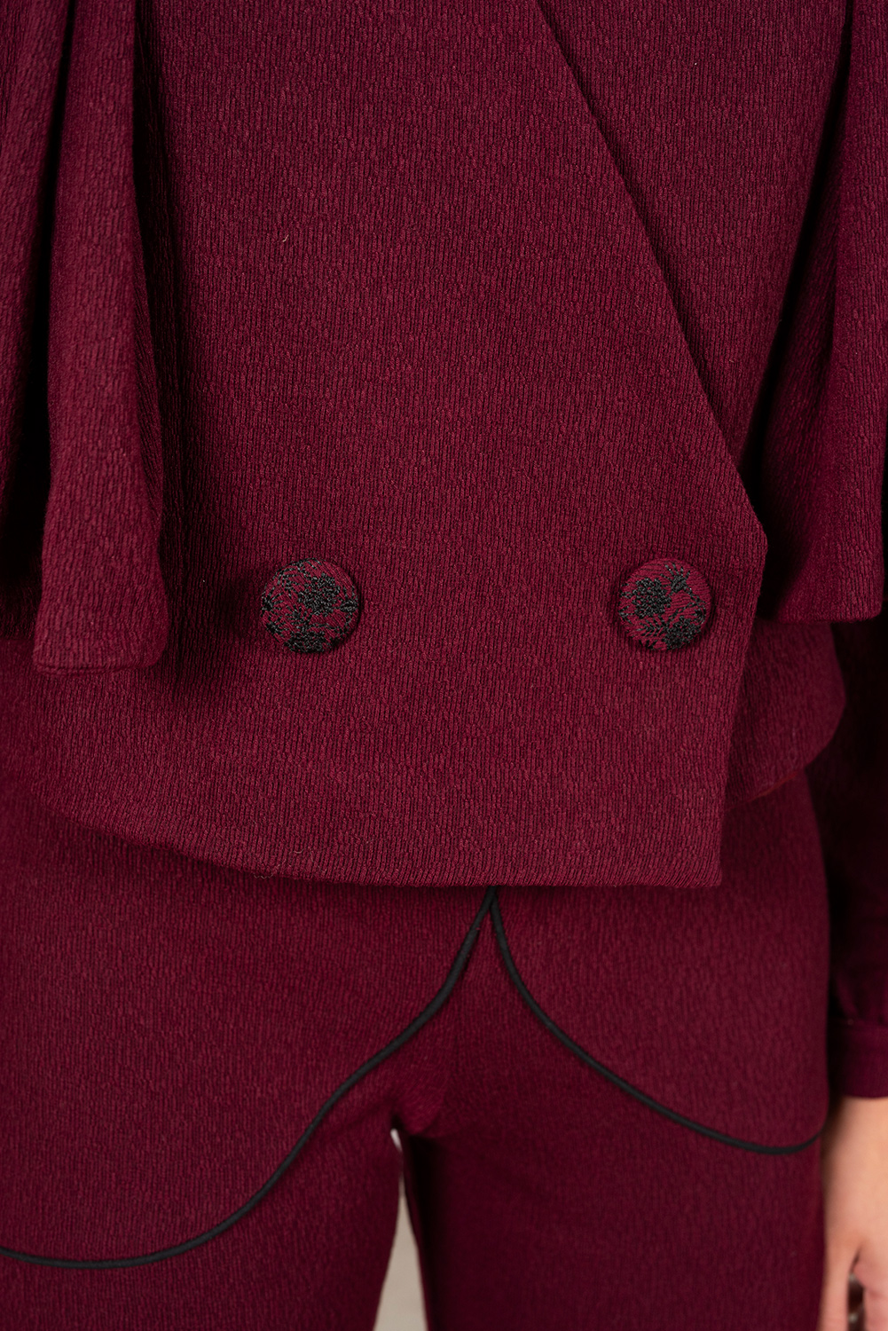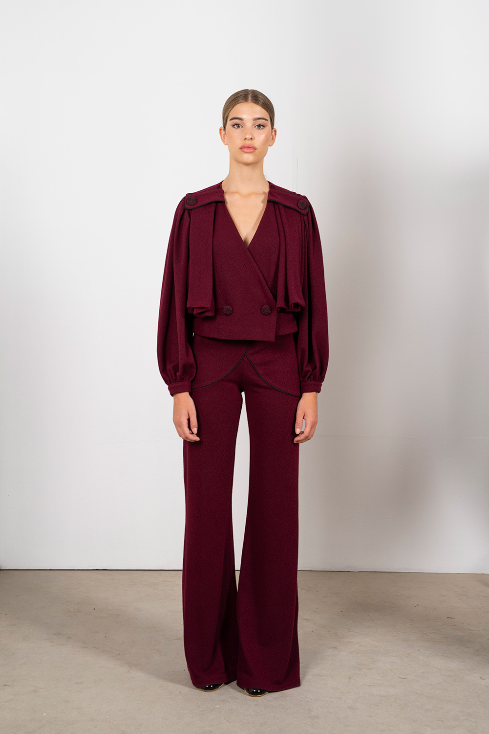 Chaqueta crop cruzada de punto: sofisticación con alma romántica. Botonadura adornada con bordado floral que aporta delicadeza, y mangas abullonadas en la parte central, tablones laterales cerrados con hebilla para un toque estructurado y distintivo. La composición y el corte crop estilizan la silueta, convirtiéndola en pieza clave para looks de día y ocasiones especiales. Versátil y especial, combínala con pantalones de talle alto o faldas para un contraste moderno y femenino. El tándem perfecto lo hace con nuestro pantalón Nora.