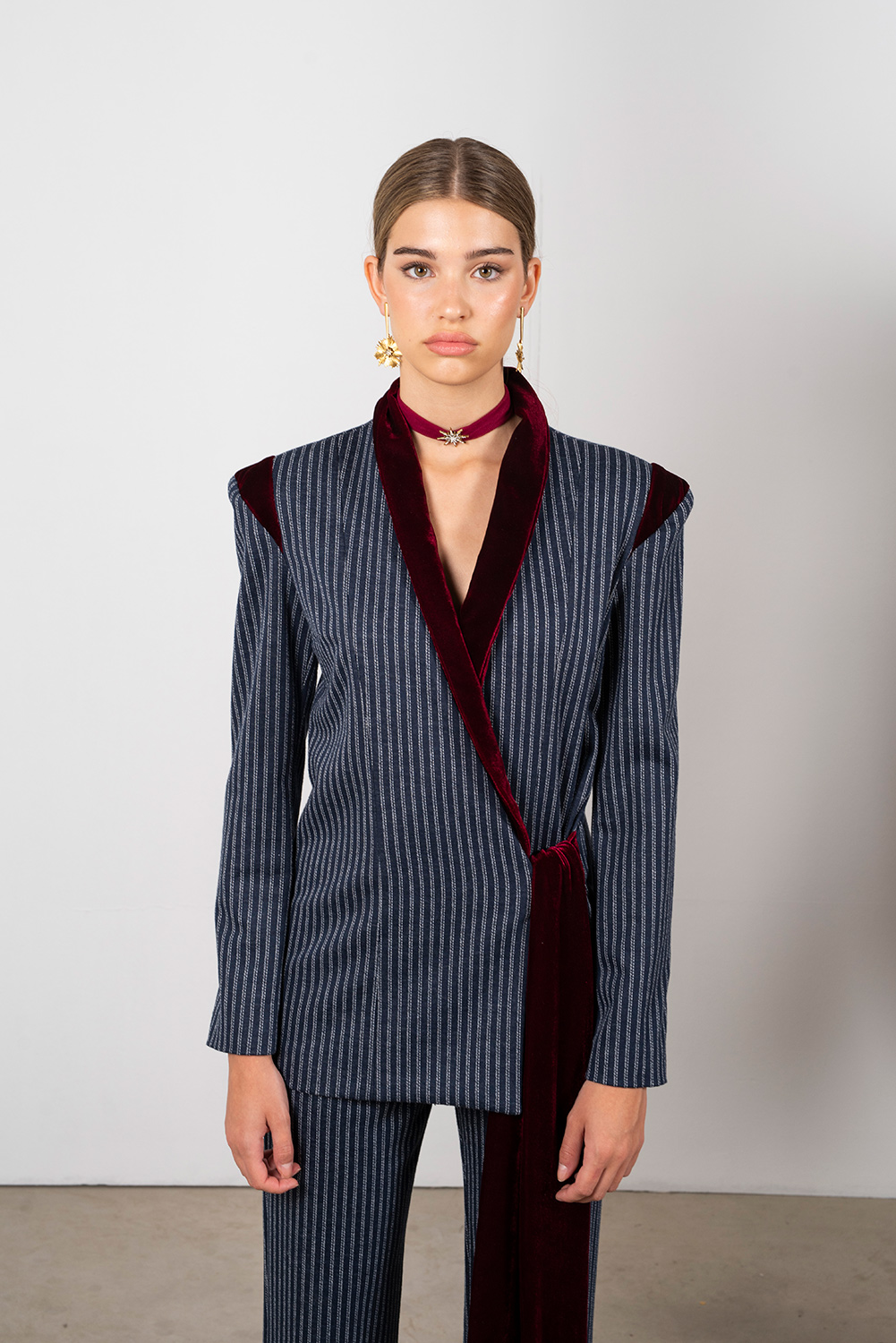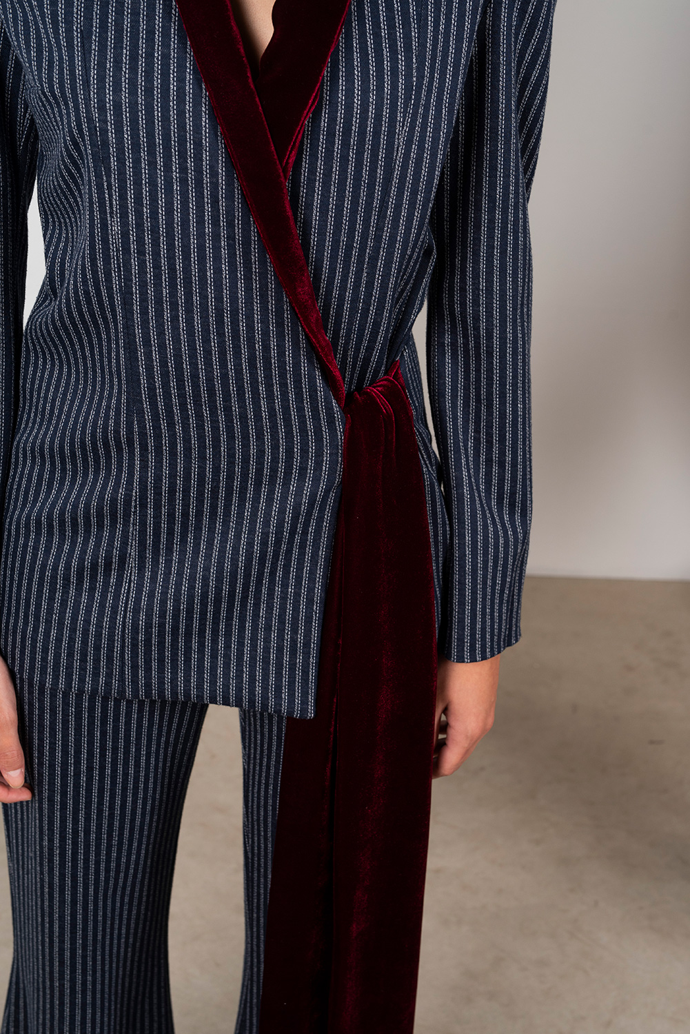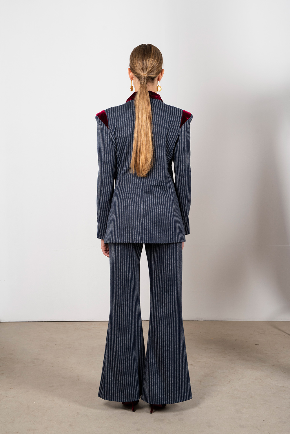 Traje de chaqueta con estampado a rayas: propuesta contemporánea y sofisticada para destacar. Chaqueta de corte cruzado con solapa, maxilazada de terciopelo y hombrera con salida que aporta estructura y presencia. Pantalón semi‑acampanado de punto a rayas que estiliza y ofrece movimiento. Cremallera trasera para un ajuste impecable que realza la figura. Perfecto para looks de oficina con actitud moderna o eventos donde buscas elegancia con carácter.