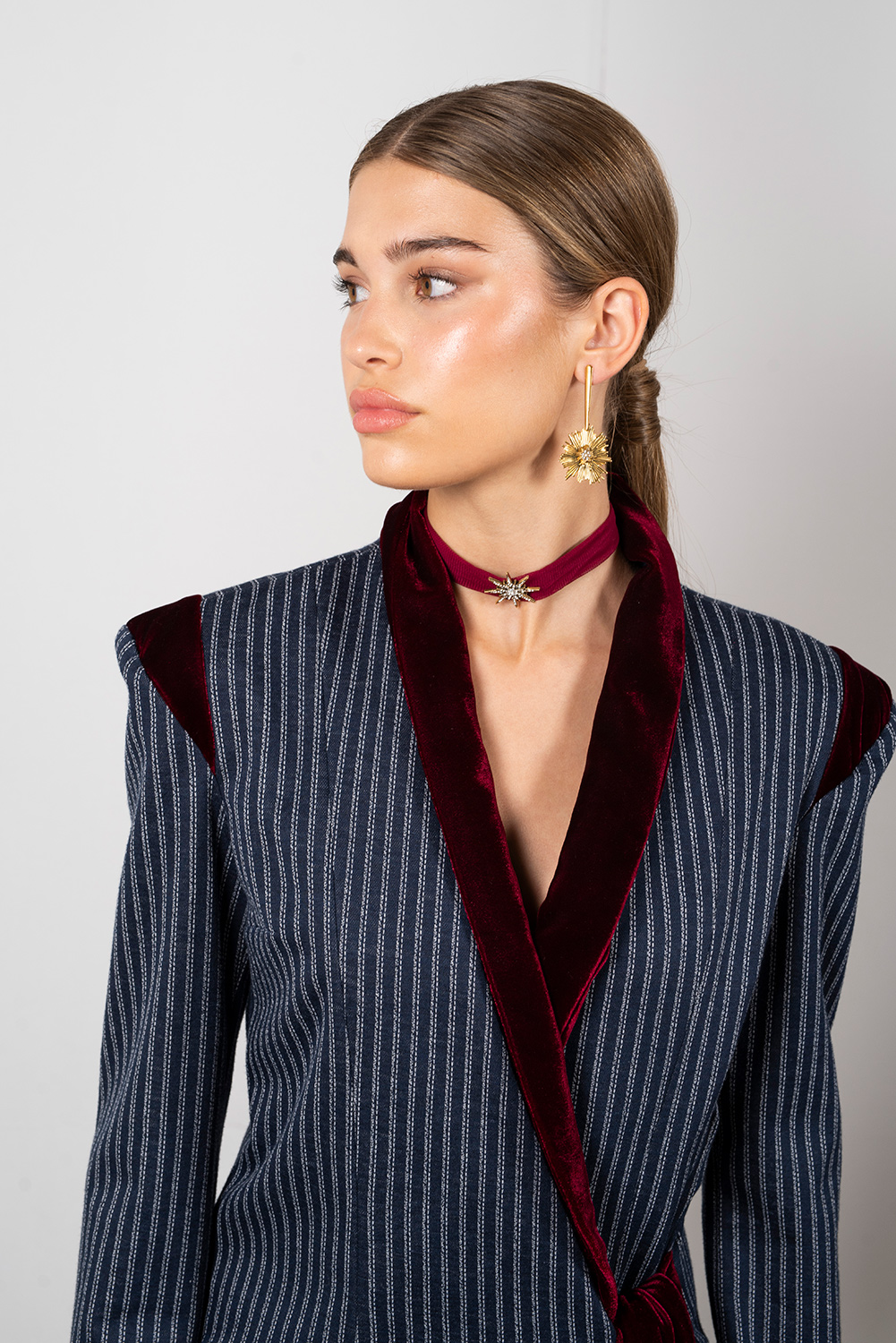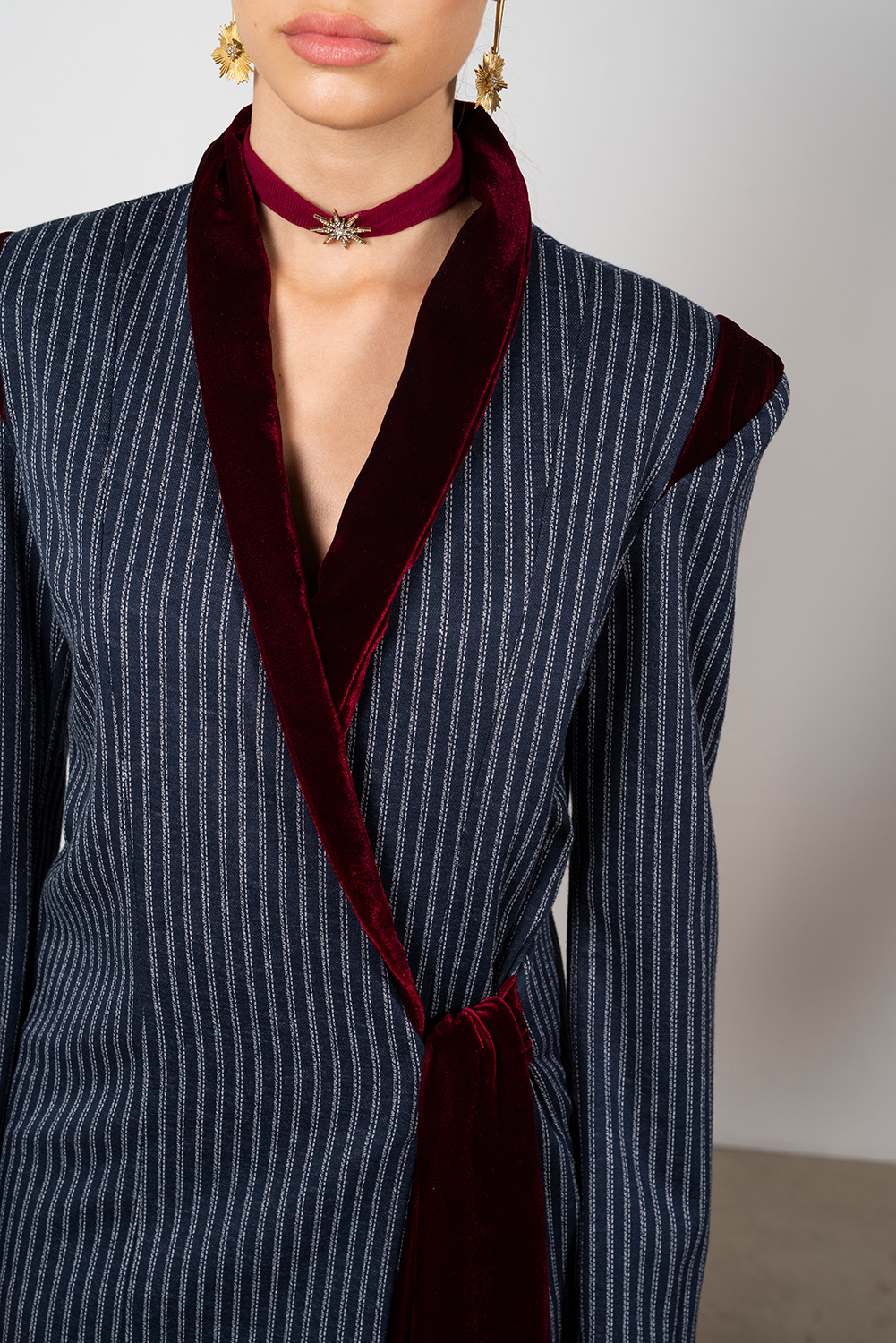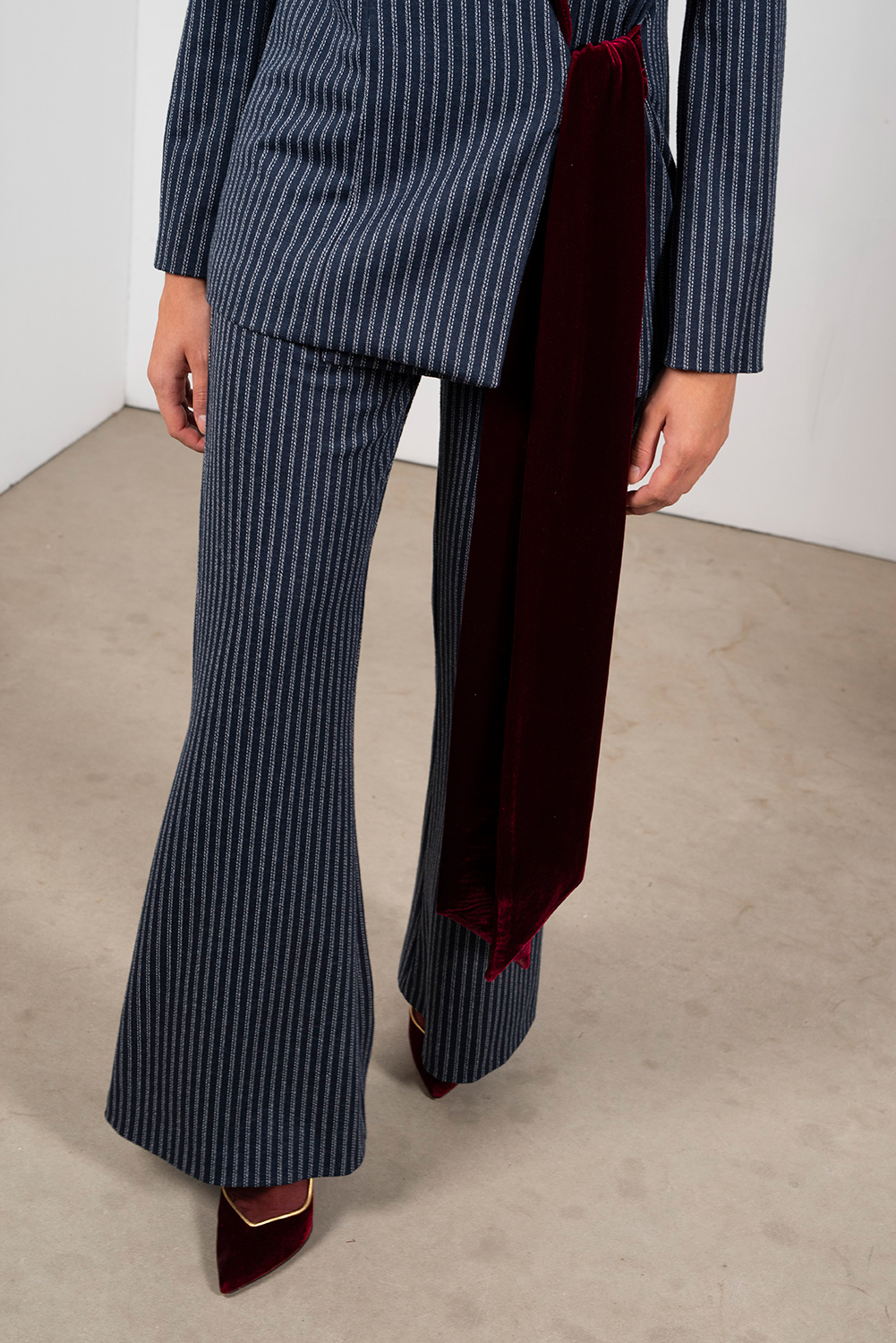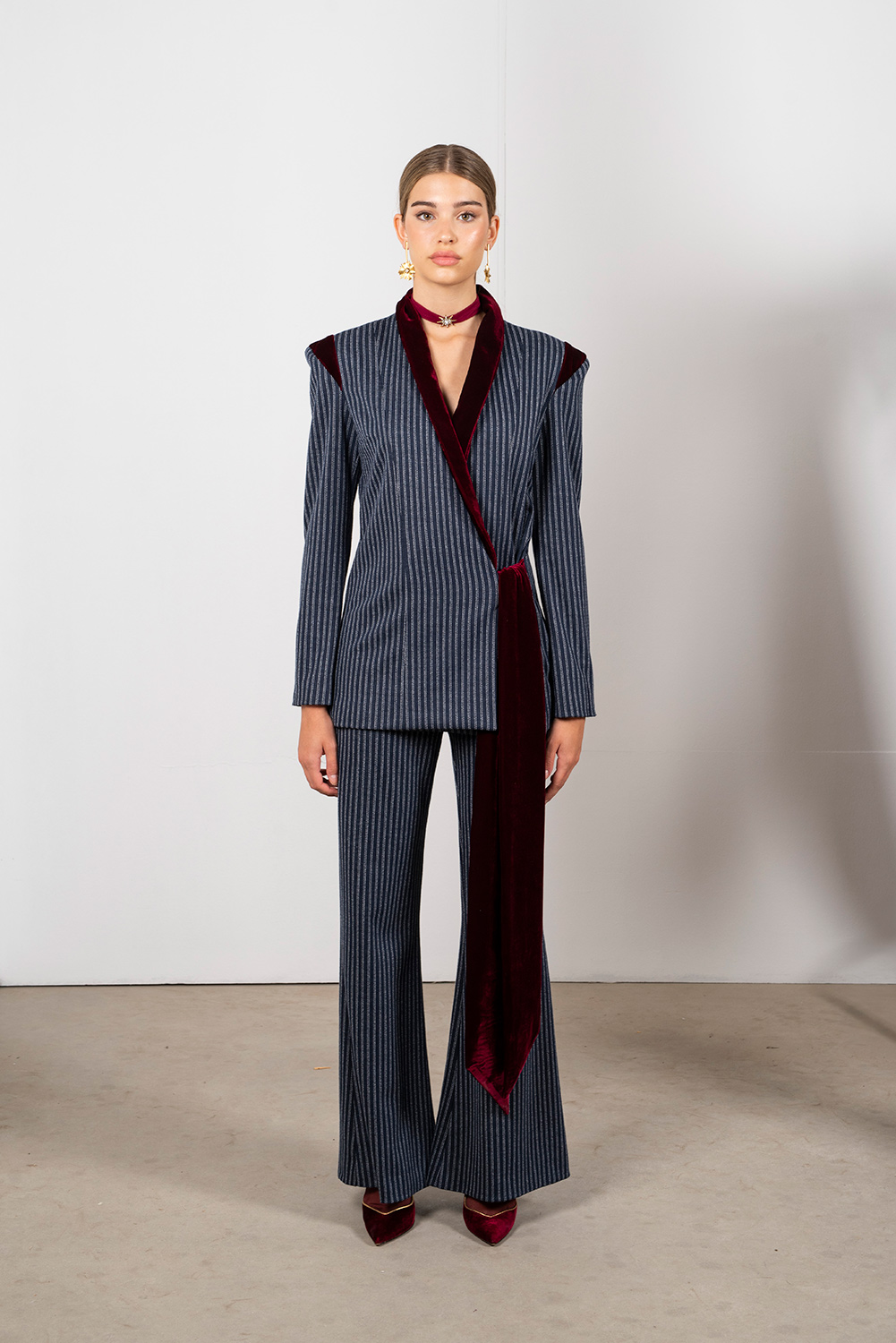 Traje de chaqueta con estampado a rayas: propuesta contemporánea y sofisticada para destacar. Chaqueta de corte cruzado con solapa, maxilazada de terciopelo y hombrera con salida que aporta estructura y presencia. Pantalón semi‑acampanado de punto a rayas que estiliza y ofrece movimiento. Cremallera trasera para un ajuste impecable que realza la figura. Perfecto para looks de oficina con actitud moderna o eventos donde buscas elegancia con carácter.