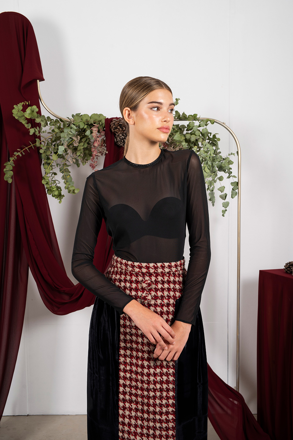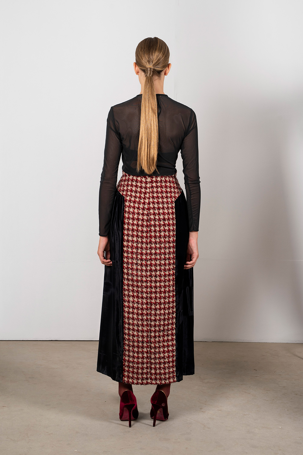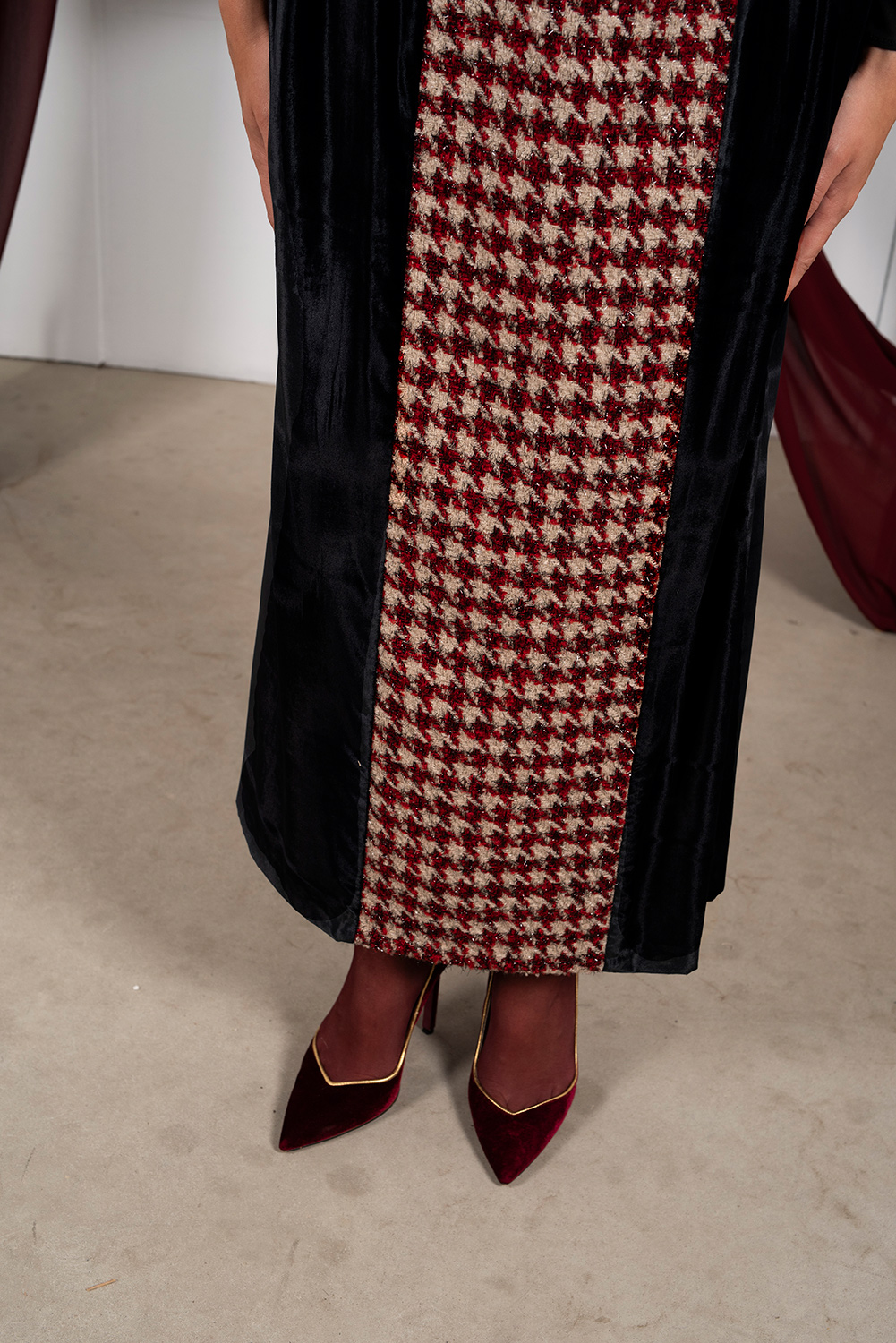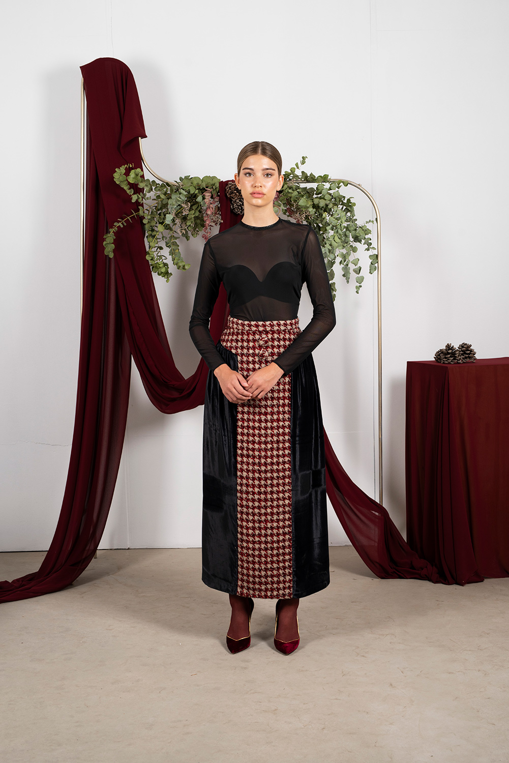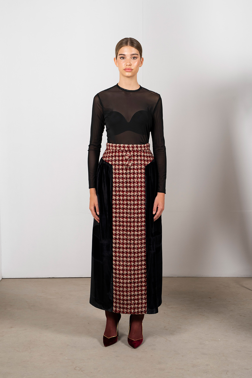 Falda midi combinada en tweed y terciopelo con frunce en cadera que realza la silueta y botones decorativos frontales que aportan carácter. Diseño sofisticado y versátil. Cintura definida y caída fluida que favorece todo tipo de figuras; combínala con blusas delicadas, botines o tacones para un look impecable. Una pieza elegante y con personalidad para renovar tu fondo de armario.