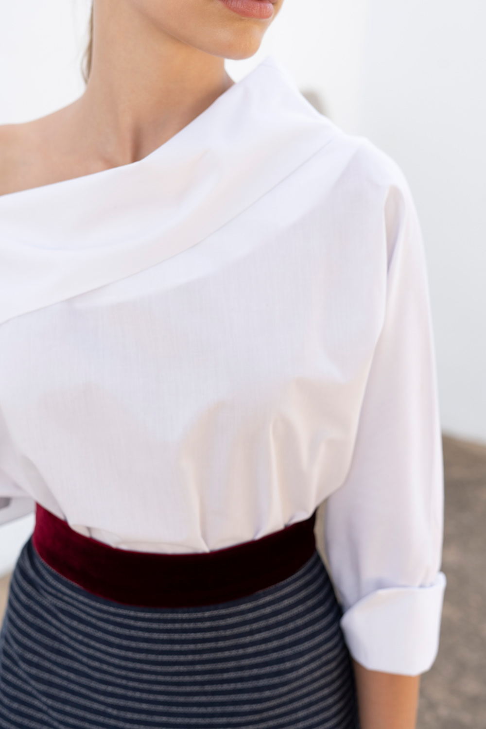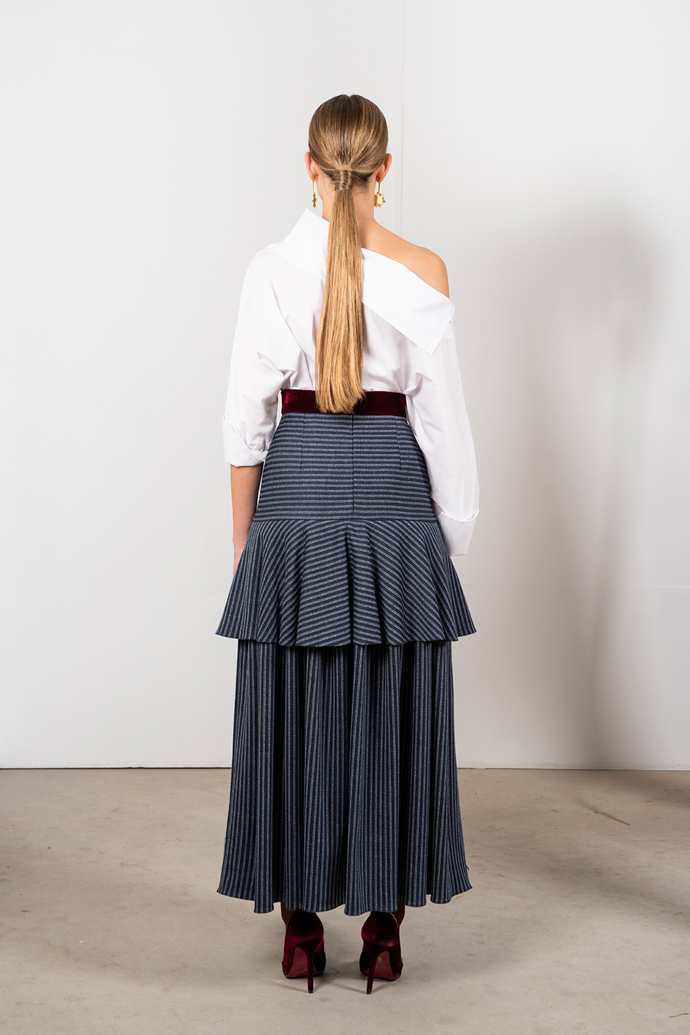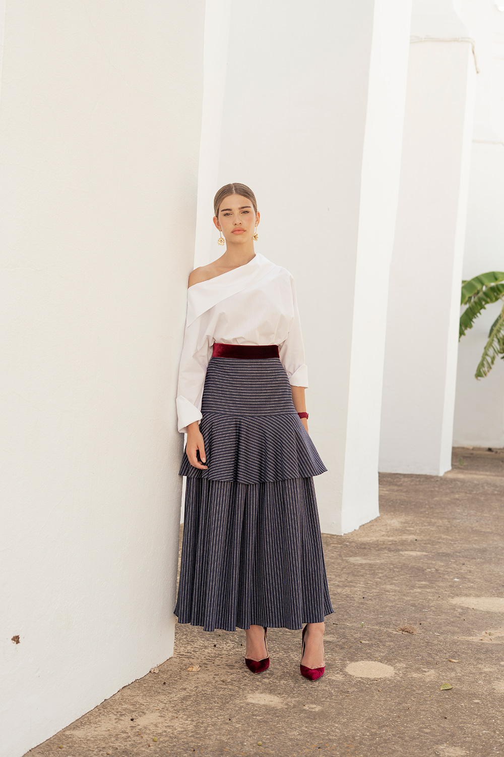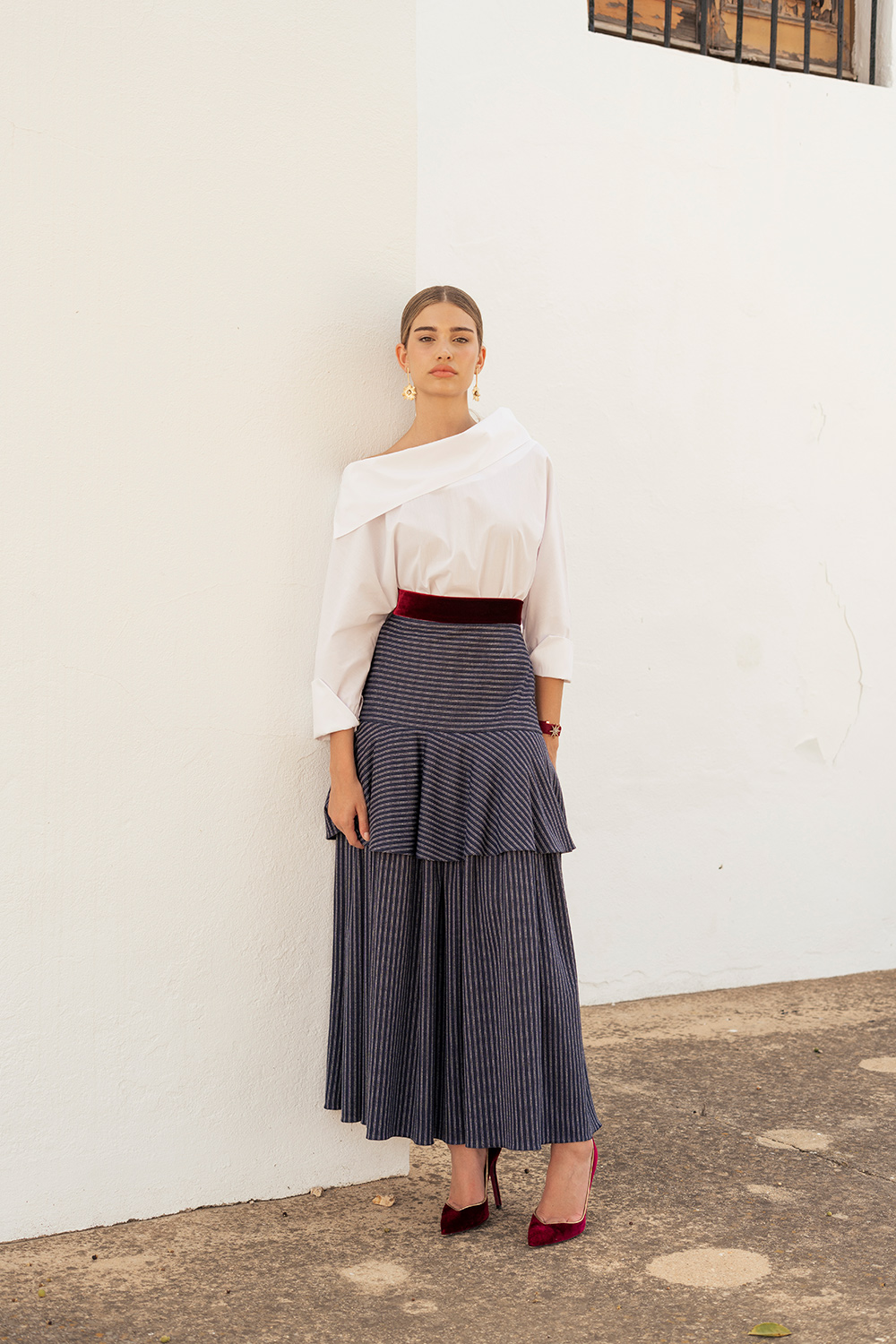 Falda de paño con estampado a rayas: pieza elegante y con carácter para tu armario. Cinturilla alta en terciopelo que aporta textura y sofisticación, cremallera trasera para un ajuste impecable y corte en cadera que realza la figura con sutileza. El paño estructurado mantiene la silueta y las rayas añaden dinamismo; perfecta para combinar con blusas suaves o jerséis ceñidos. Ideal para looks de oficina y eventos con estilo.