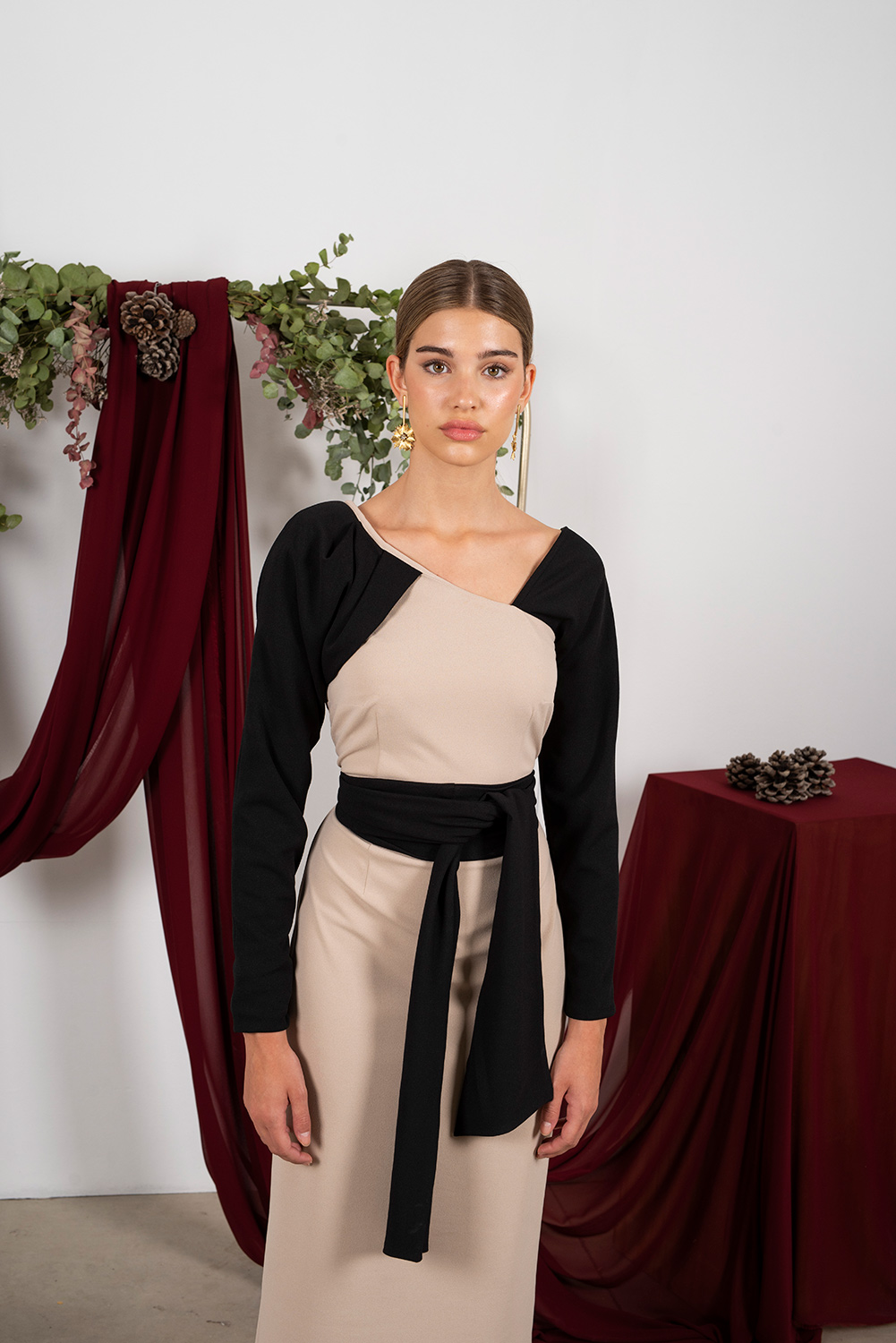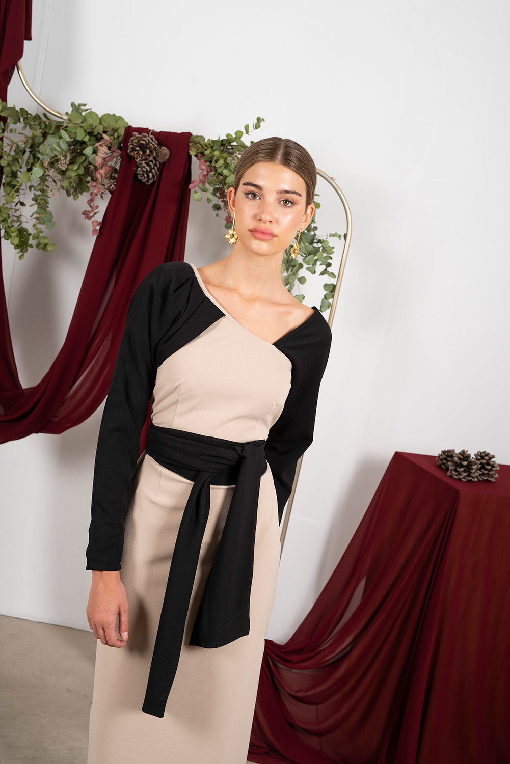 Vestido de punto con escote asimétrico: sofisticación contemporánea que realza tu figura. Largo midi y falda lápiz que estilizan la silueta, mientras la lazada en cintura marca la proporción perfecta. El escote asimétrico añade un toque inesperado y sensual, ideal para destacar en cualquier ocasión. Confeccionado en punto de caída elegante que abraza sin rigidez. Combínalo con tacones o botas para un look versátil y femenino, perfecto del día a la noche.
