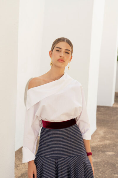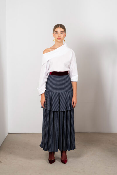 Falda de paño con estampado a rayas: pieza elegante y con carácter para tu armario. Cinturilla alta en terciopelo que aporta textura y sofisticación, cremallera trasera para un ajuste impecable y corte en cadera que realza la figura con sutileza. El paño estructurado mantiene la silueta y las rayas añaden dinamismo; perfecta para combinar con blusas suaves o jerséis ceñidos. Ideal para looks de oficina y eventos con estilo.