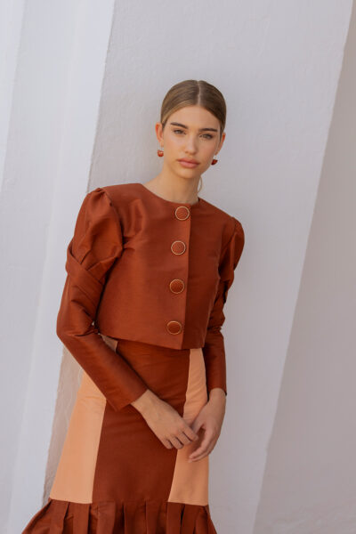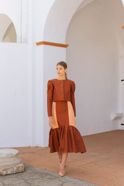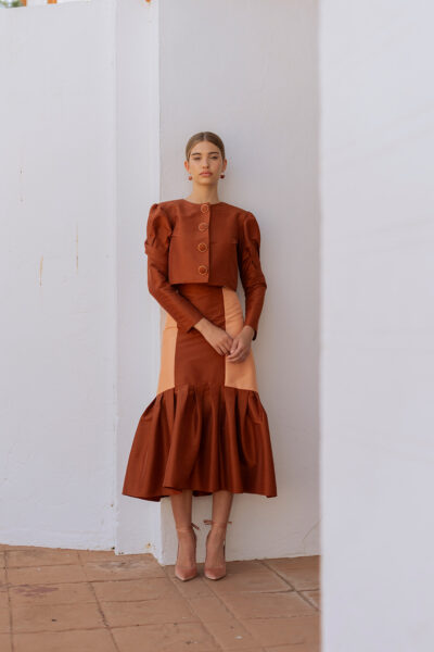 La falda bicolor de tafetán con elastano: cinturilla alta que estiliza la cintura y cremallera trasera para un ajuste impecable. La parte inferior tableada aporta volumen y fluidez, mientras la superior entallada realza la figura con elegancia. Ideal para convertirse en la protagonista de tu look. Combínala con nuestro top Crisanta y chaqueta Teana y serás la invitada que acapare todas las miradas.