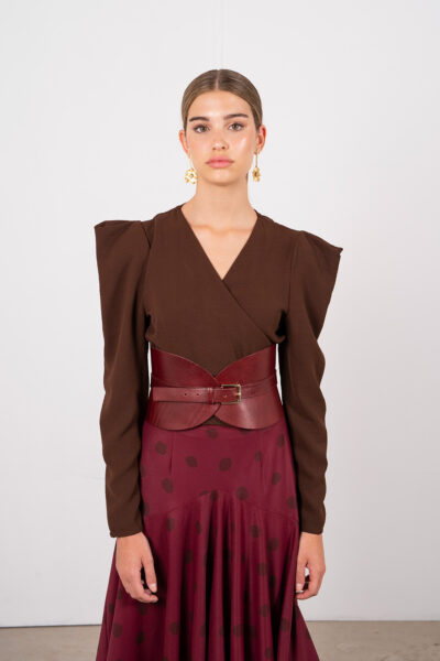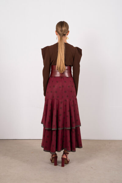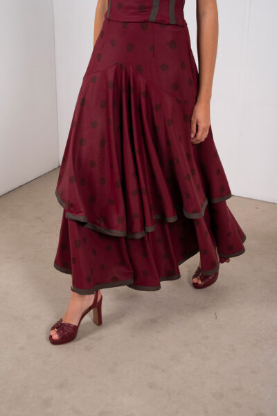 Conquista la temporada con nuestra falda de lunares, el print más deseado. Su cinturilla alta define la silueta, mientras los dos volantes a capa, rematados con vivos, aportan movimiento y un acabado impecable. La cremallera trasera asegura un ajuste limpio. Perfecta para invitadas y looks de día a noche.
