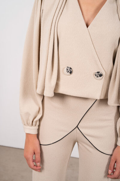 Pantalón bombacho con detalle artesanal: comodidad con carácter. Corte bombacho que aporta volumen y movimiento, fruncido y atado al tobillo con hebilla y cierre con botón bordado que añade un guiño artesanal y exclusivo para un acabado urbano y femenino.. Versátil para combinar con tops ceñidos o chaquetas estructuradas, es la pieza ideal para looks casual-chic que buscan originalidad sin renunciar al confort. Perfecto del día a la noche.