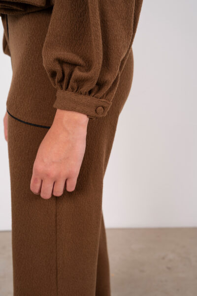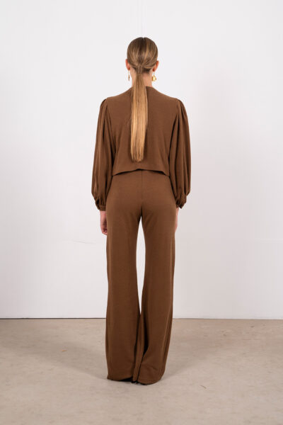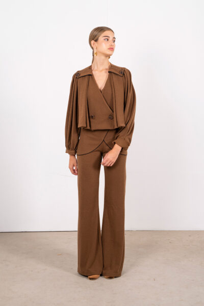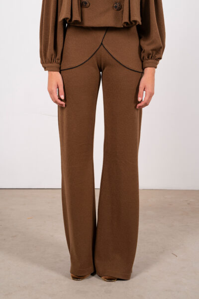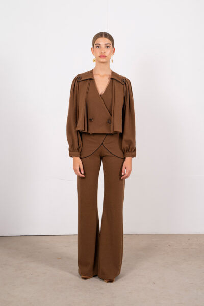 Este pantalón semi acampanado de punto y con cremallera trasera, garantiza un ajuste perfecto, realzando tu figura en cada movimiento. Imagina combinarlo con la chaqueta Aegea: juntos forman un traje que no solo destaca en cualquier evento, sino que también refleja una personalidad audaz y segura. Este dúo se convierte en tu aliado ideal para conquistar desde reuniones de trabajo hasta cenas informales, haciendo que cada momento sea inolvidable.