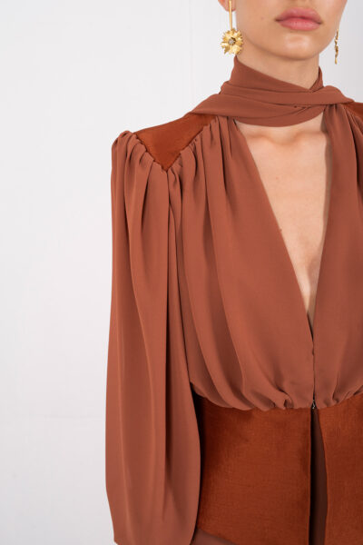 Descubre la chaqueta que redefine la femineidad: gasa y tafetán con maxipuños abotonados, escote pico y corte peplum que realza la figura. Hombros marcados para una silueta assertiva y un foulard multiposición incorporado para múltiples looks en uno. Ideal para combinar con la falda Sofía y triunfar con tu look de invitada.